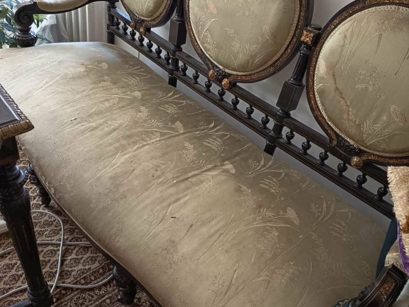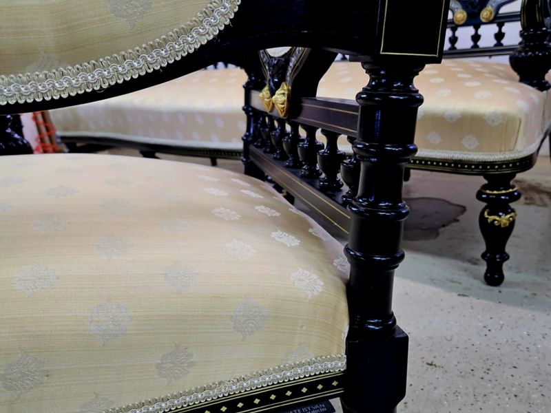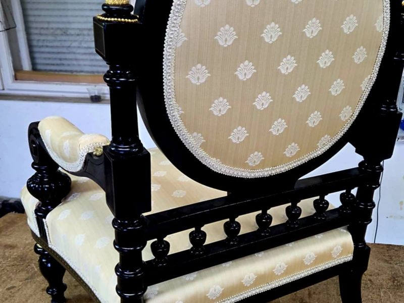 Ennél a garnitúránál a formára is érdemes figyelmet fordítani: öt kör alakú háttámla ünnepélyes ritmussal, hangsúlyos, ívelt karfákkal, fekete alapon réz díszítésekkel. A kárpitozás során különösen fontos volt a szövet mintájának tökéletes szimmetriája – a kerek háttámlák középpontját precízen kellett kijelölni, mert itt minden apró eltérés azonnal láthatóvá válik.