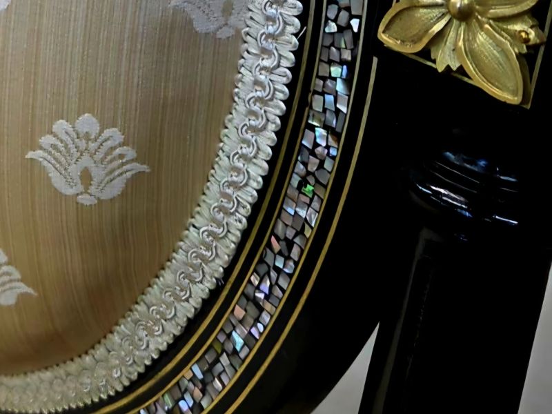 Ez a réz- és kagylóberakásos Boulle-intarziás garnitúra a XVII–XVIII. századi francia udvari művészet világát idézi meg, de maga a bútor már a XIX. század végén, Magyarországon készült. A névadó mesterről már korábban is írtam, André-Charles Boulle-ról, (1642–1732) aki XIV. Lajos udvari ébenmestere volt, és aki a kagyló, sárgaréz és más nemes anyagok kombinálásával forradalmasította az intarziaberakás művészetét. A XIX. század második felében Európa-szerte újra felfedezték és előszeretettel utánozták ezt a gazdag, reprezentatív díszítést.